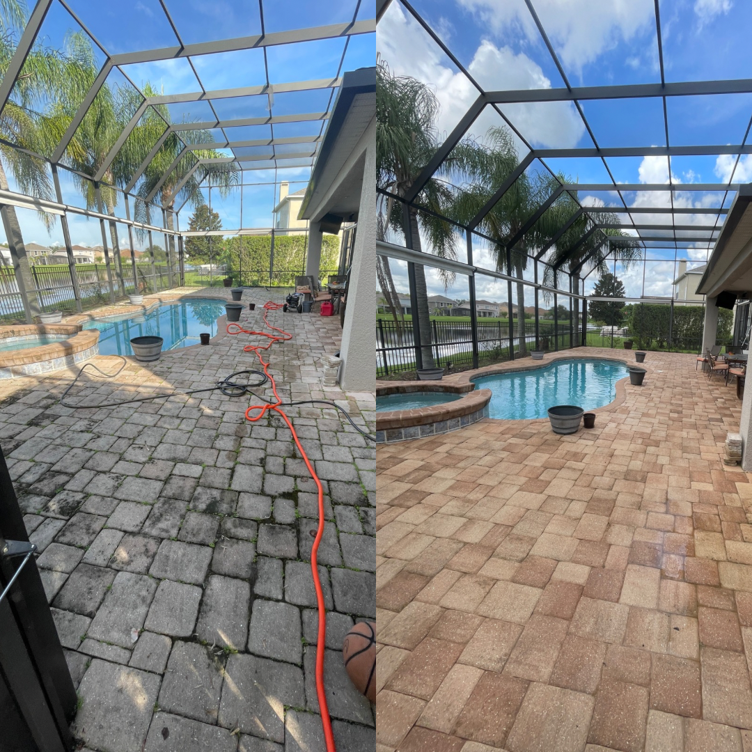Pool area cleaning uses low-pressure washing and specialized solutions to safely clean the pool cage, screens, deck, and surrounding surfaces, removing dirt, algae, and mildew for a fresh and inviting space.